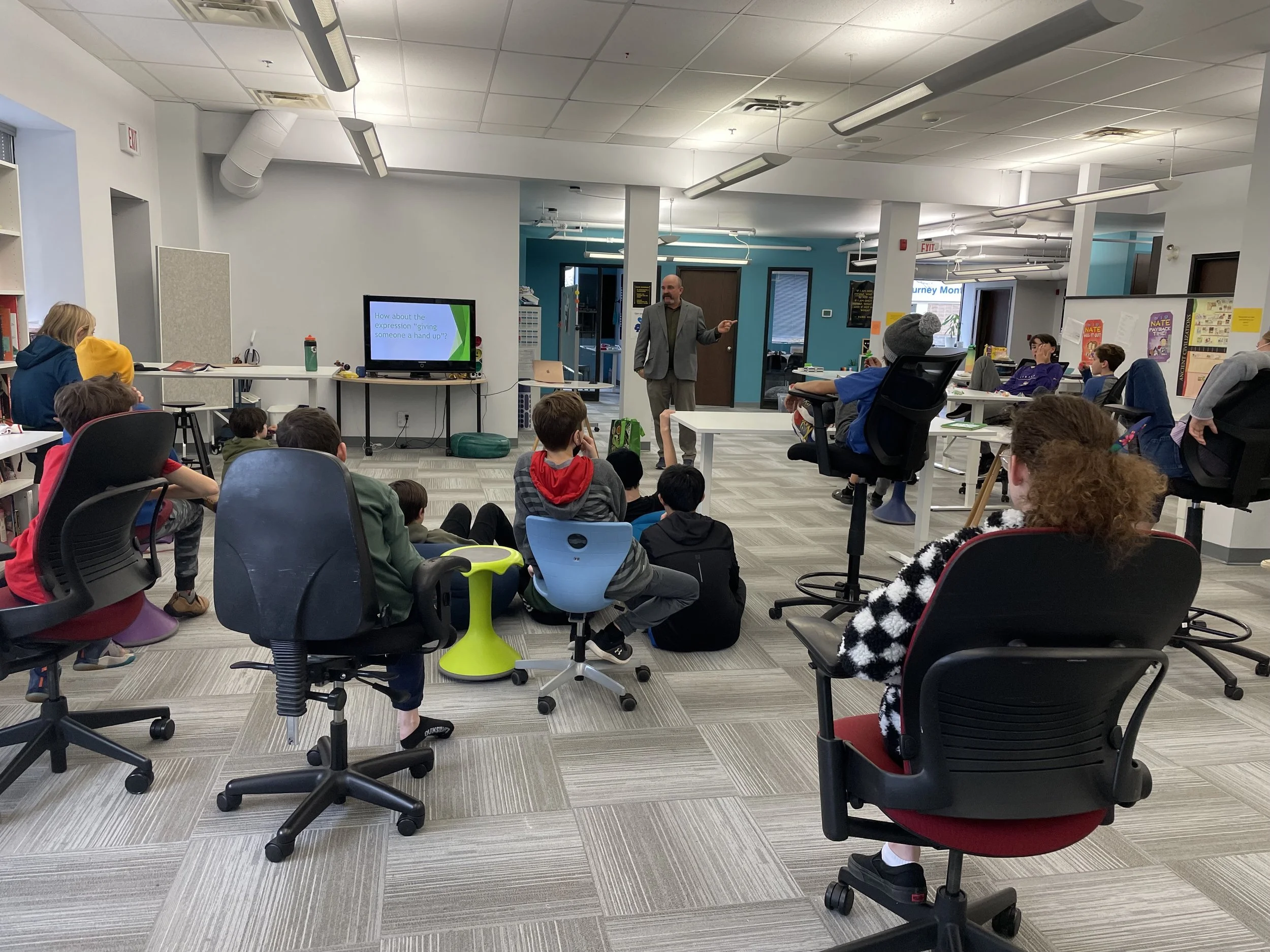 On Monday, we played the interview game where the Rebels had to hire classmates for positions within their company. We also played the Questions-Ballon game to continue our conversational exposure. We finished our worksheets about our businesses and played North-South in the gym to learn Thanksgiving and fall vocabulary on Wednesday. For our French Story Workshop, we played "It's Me" and other get-to-know-you games with the Sparks in preparation for being paired up next week!
