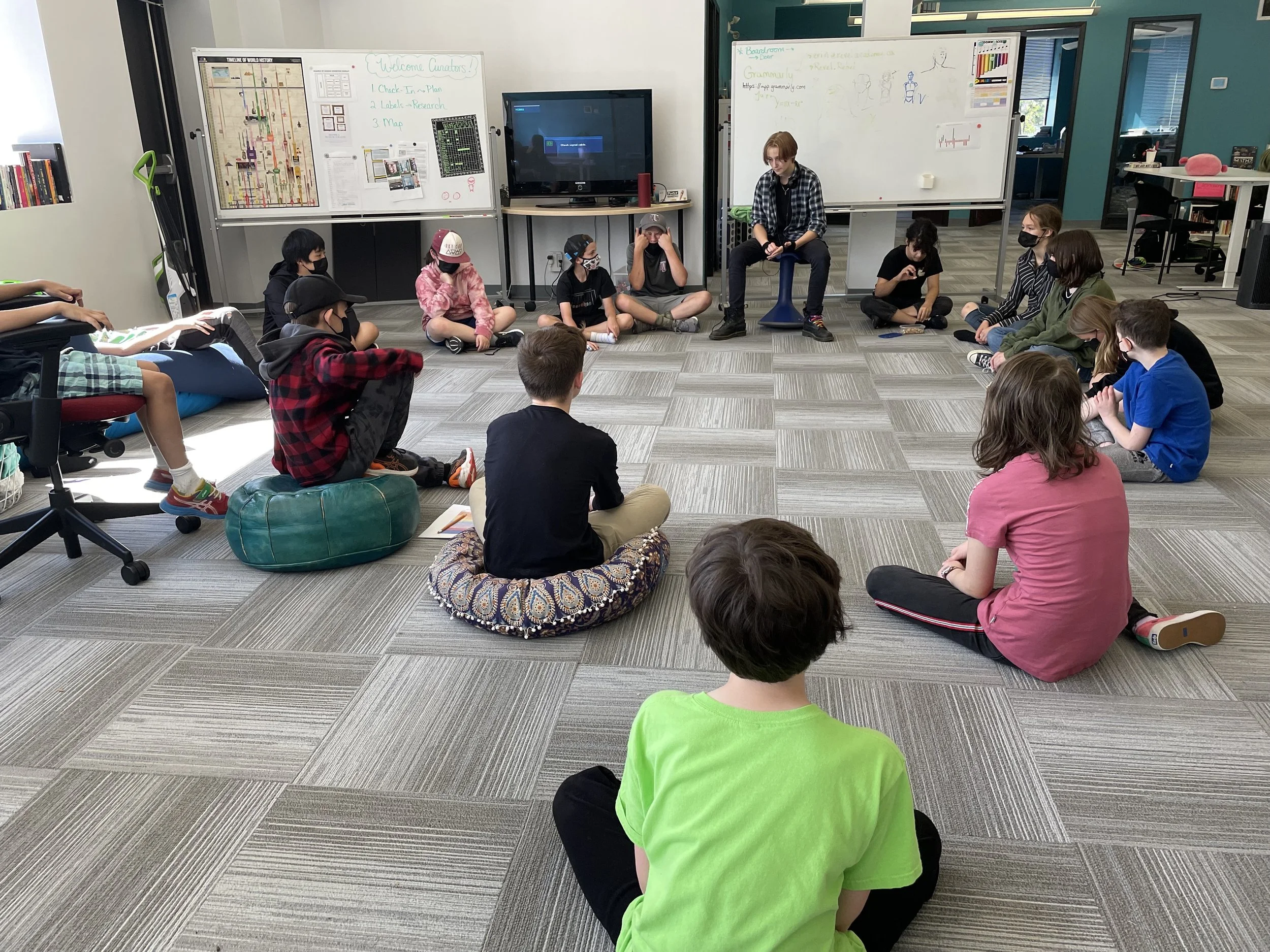 This week's KnowledgeHook Gameshow featured questions about location, grids and coordinates. We explored the different ways that someone can indicate location using examples like letter-number systems seen in an atlas or a game of Battleship. Some Rebels were ready to try using x-y coordinate systems, and we carefully examined how mixing up the order of the numbers results in a very different location. We all agreed that precision is key no matter what method you use! Next, the Rebels began their latest task for the upcoming Math Carnival. They had to select and set up a grid system to map out the booths that will be set up in the studio. Using the carpet "tiles" as a starting point, they had to measure the perimeter and area of the space and then map out their booth locations.