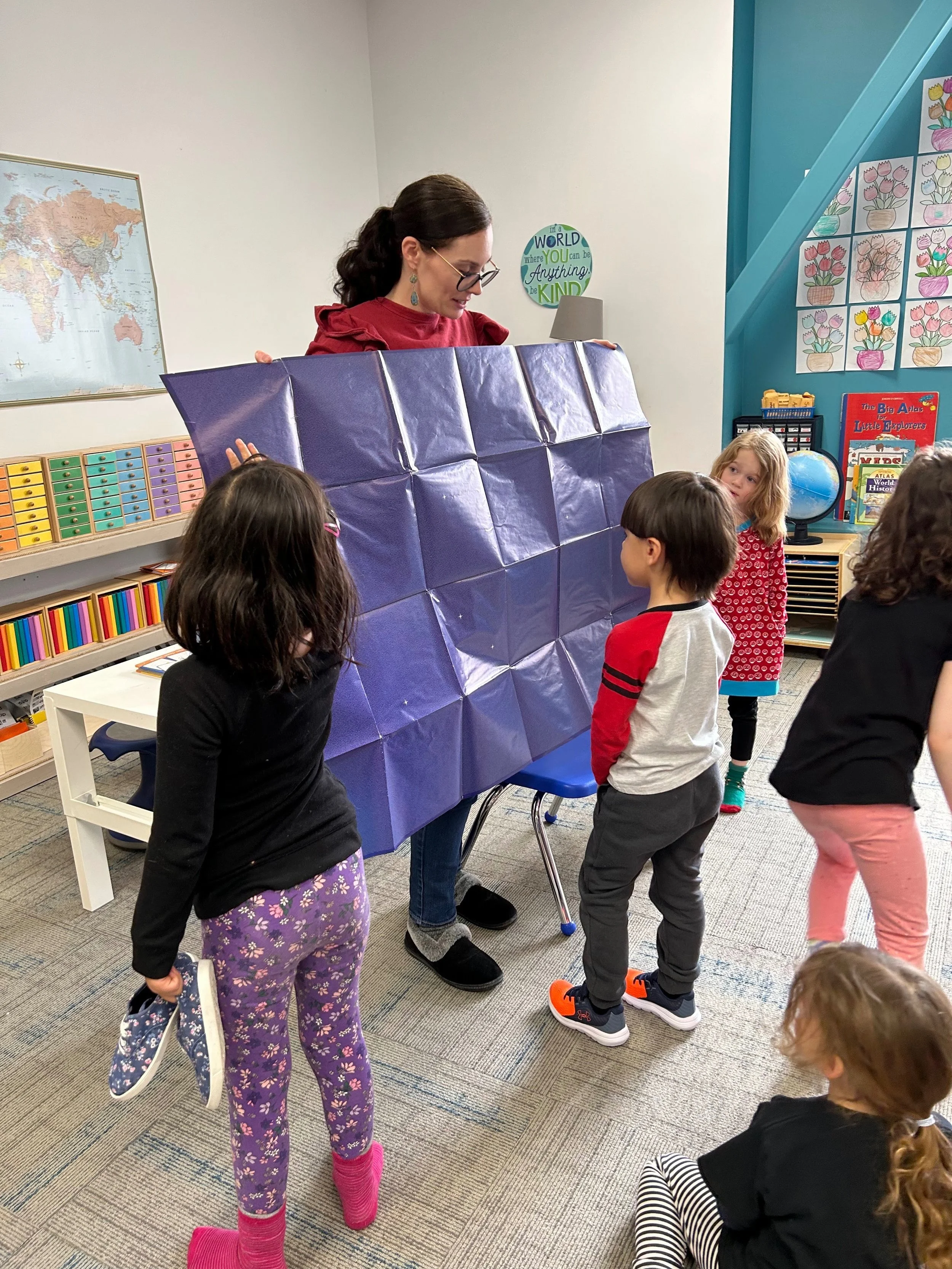 For Math this week, both groups read How Big is a Million. This book is about a penguin curious about how big a million is. This book is an excellent introduction to large numbers and place value. Numbers can be so abstract, which is why we love the math materials in our studio. During the book, we also reviewed our Golden Bead materials. When Pipkin the penguin counted ten fish, we counted our ten bead bar. We followed along, looking at our 100 and 1000 bead material and the corresponding number cards, observing how many zeros were in each number. At the end of the book, there was a special envelope, and inside there was a massive poster with one million stars! The Sparks were amazed to see this large number illustrated and curious about numbers beyond one million!