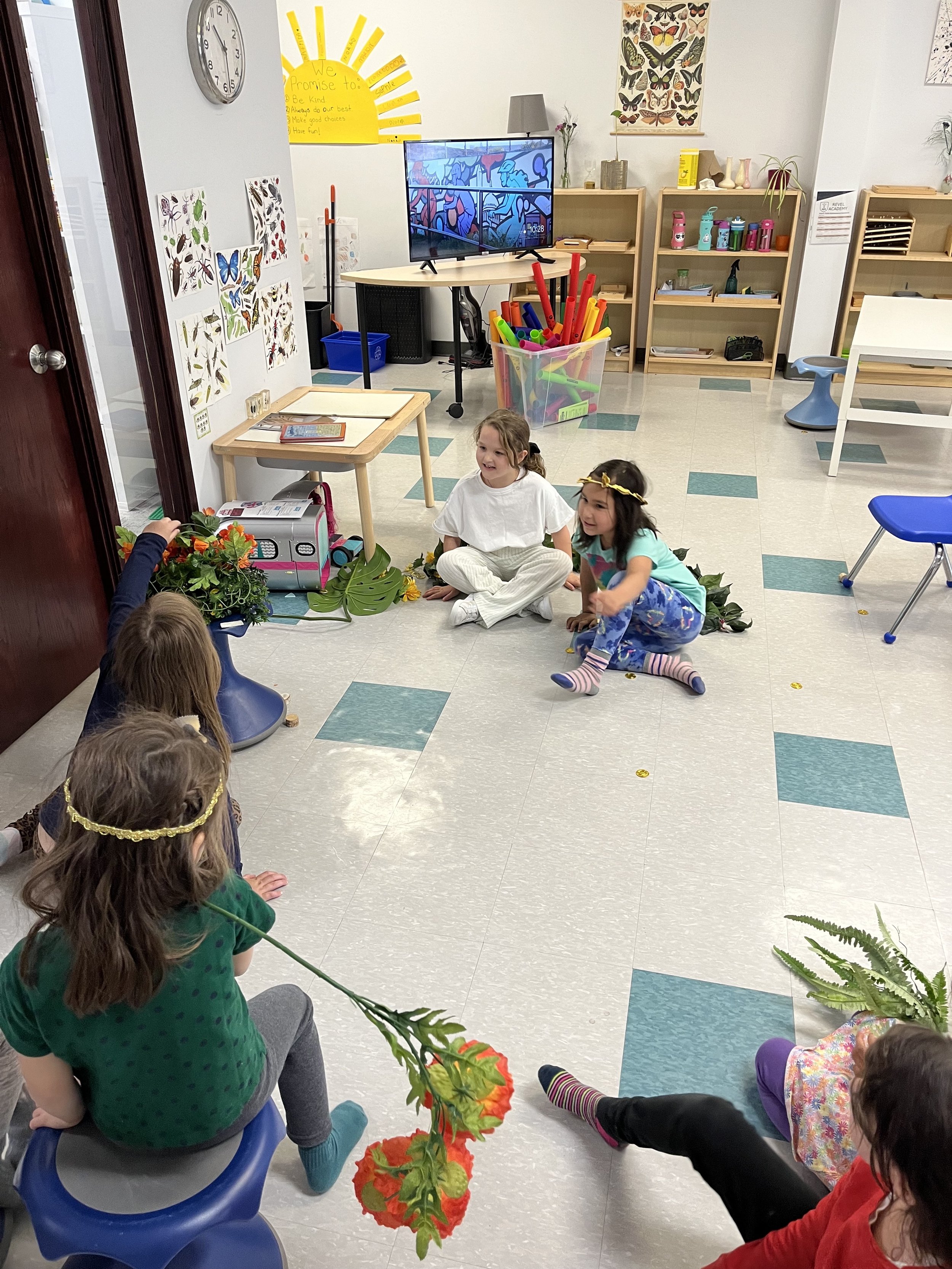 The Sparks were excited to add some new props to their storytelling this week, which included pretend plants, leaves, flowers and money! They got into groups and were challenged to incorporate the elements of a story, such as a title, characters, beginning, middle and end. We always enjoy seeing the ideas, excitement and group work during storytelling workshops!